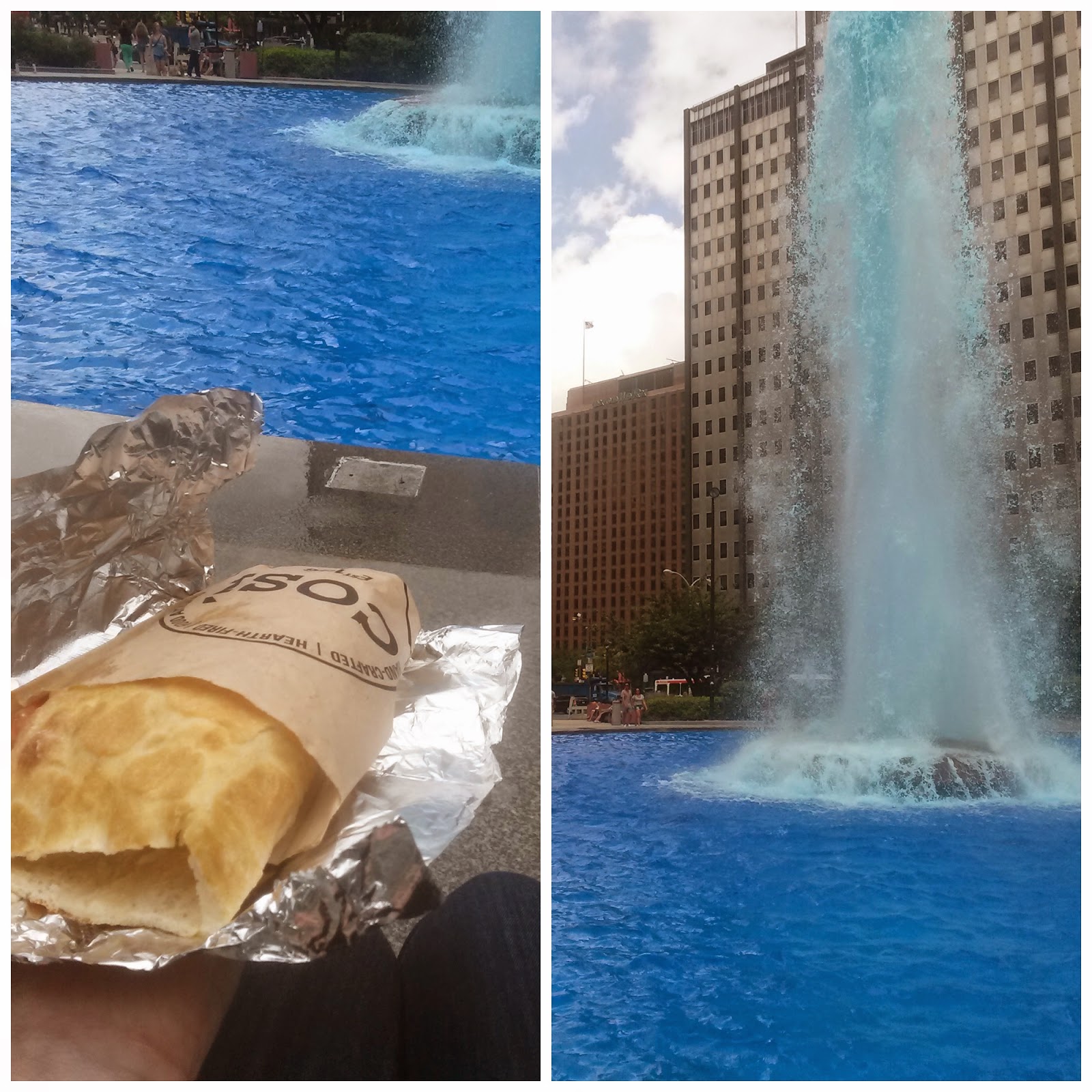 7. Yesterday I enjoyed a sandwich (a treat from work) and ate by my usual spot at the fountain in Love Park. The fountain was dyed a pretty blue!!