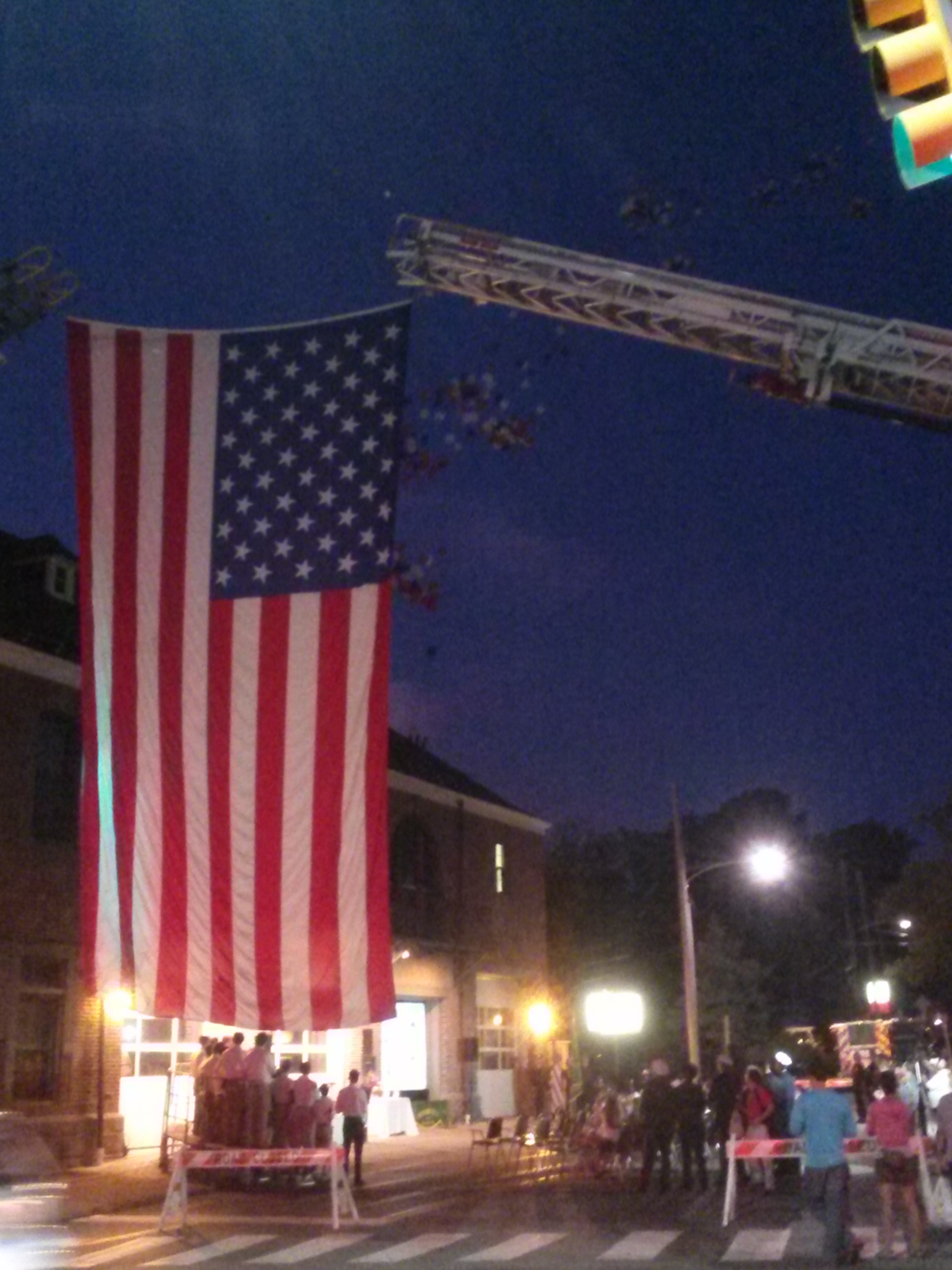 Since I was there early, I was able to relax in the empty yoga room until other students arrived and the class started at 6. Practice was cut 15 min short due to the teacher’s other commitment but I really didn’t mind. I saw it as 15 more minutes in my evening and went on without rushing, deciding last minute to stop at Trader Joes for a few things. Then I continued driving home and noticed firetrucks and a street blocked off. The fire truck ladders hung a flag, our flag for the USA! I suddenly forgot that I was hungry and had not eaten dinner yet. I turned onto my street, took my time to park and walked around the corner to watch the last 20 minutes of the ceremony.