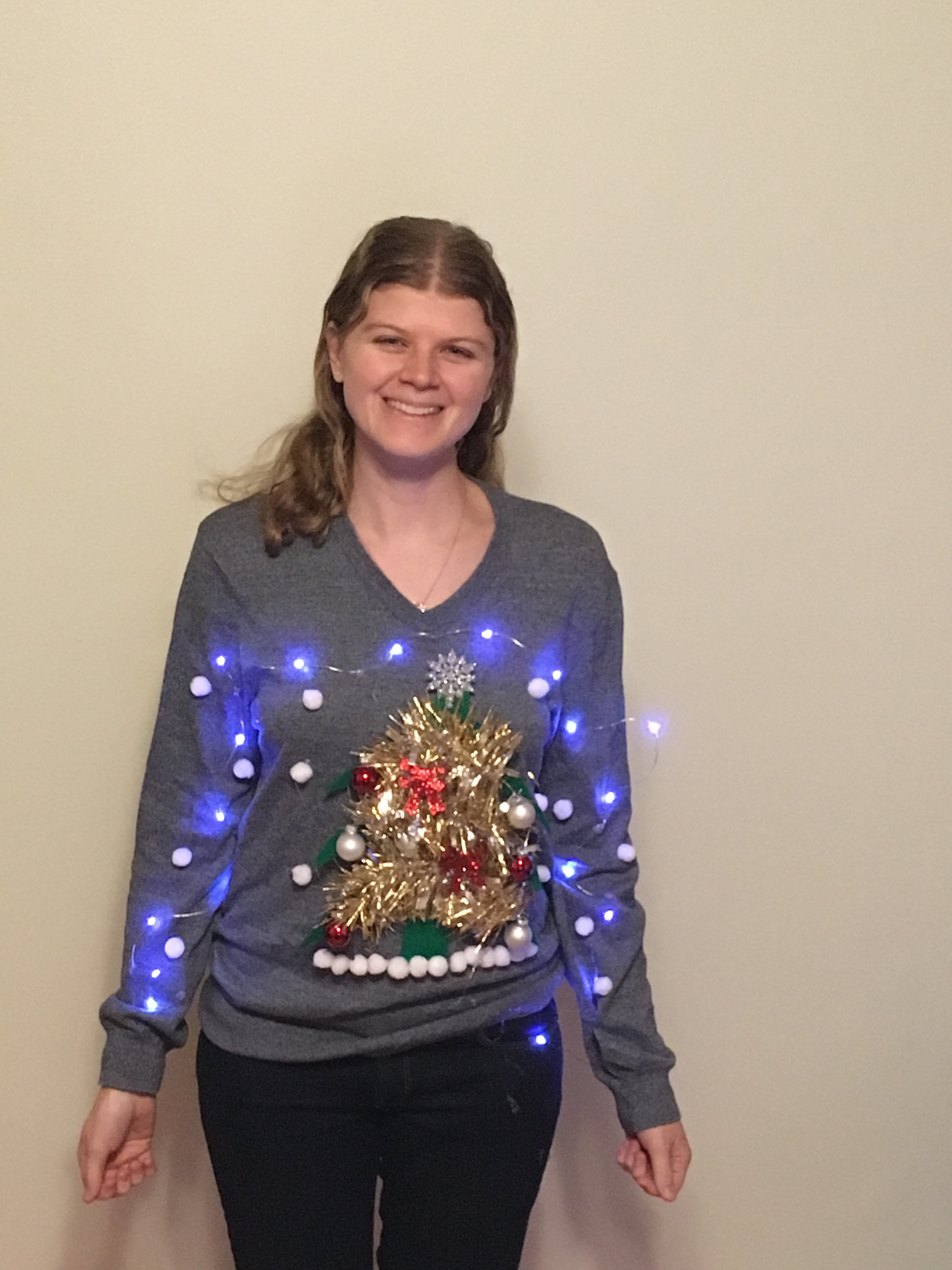 I realized after making my sweater, the tree is off center…but that’s ok because it’s supposed to be an ugly sweater anyway right?! Also I set the lights so that the battery pack perfectly lines up to be in my pocket.